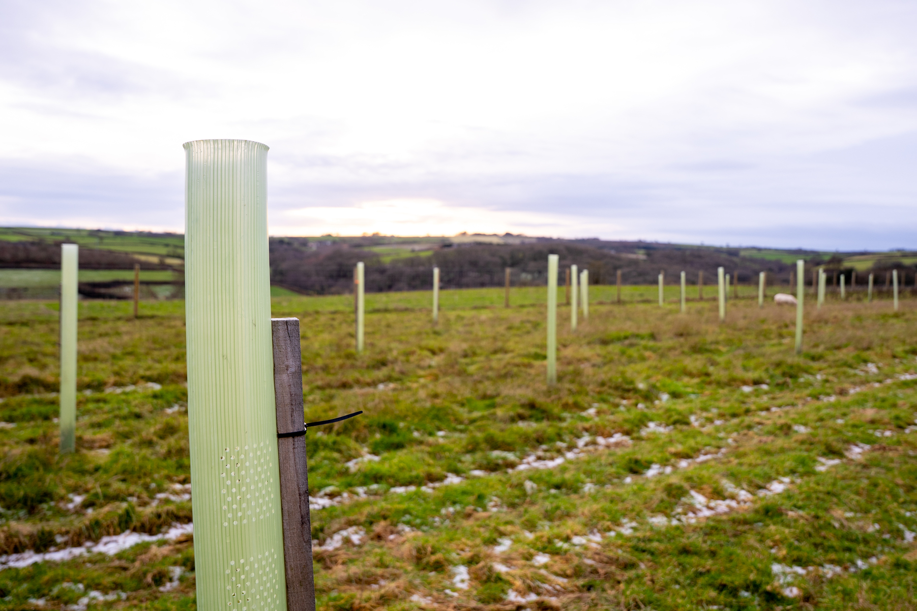 Yes, we use tree guards where we need to, to protect young saplings that are extremely vulnerable to damage from deer and other wildlife. Wherever possible, we have used fencing instead so that only small areas require tree guards. Where we need to use tree guards, they will always be made from recyclable plastic.
