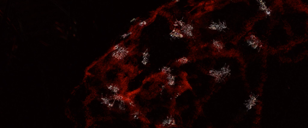 Simon Blackmore, Antony Hall and Steve Symons, the collaborative group of artists known as Owl Project, have been exploring the forest floor, lifting up logs and looking under stones to film ants going about their business in Fineshade Wood. Using cameras and software to visualize the routes taken by these creatures to allow for what seems like chaos to be rendered as pattern.
