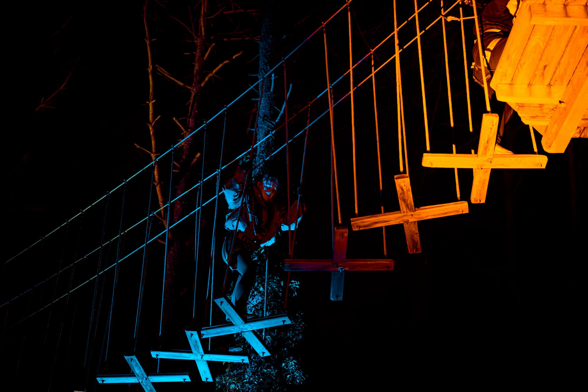 Test your skills on tree top crossings and experience the thrill of a zip wire ride into the darkness.