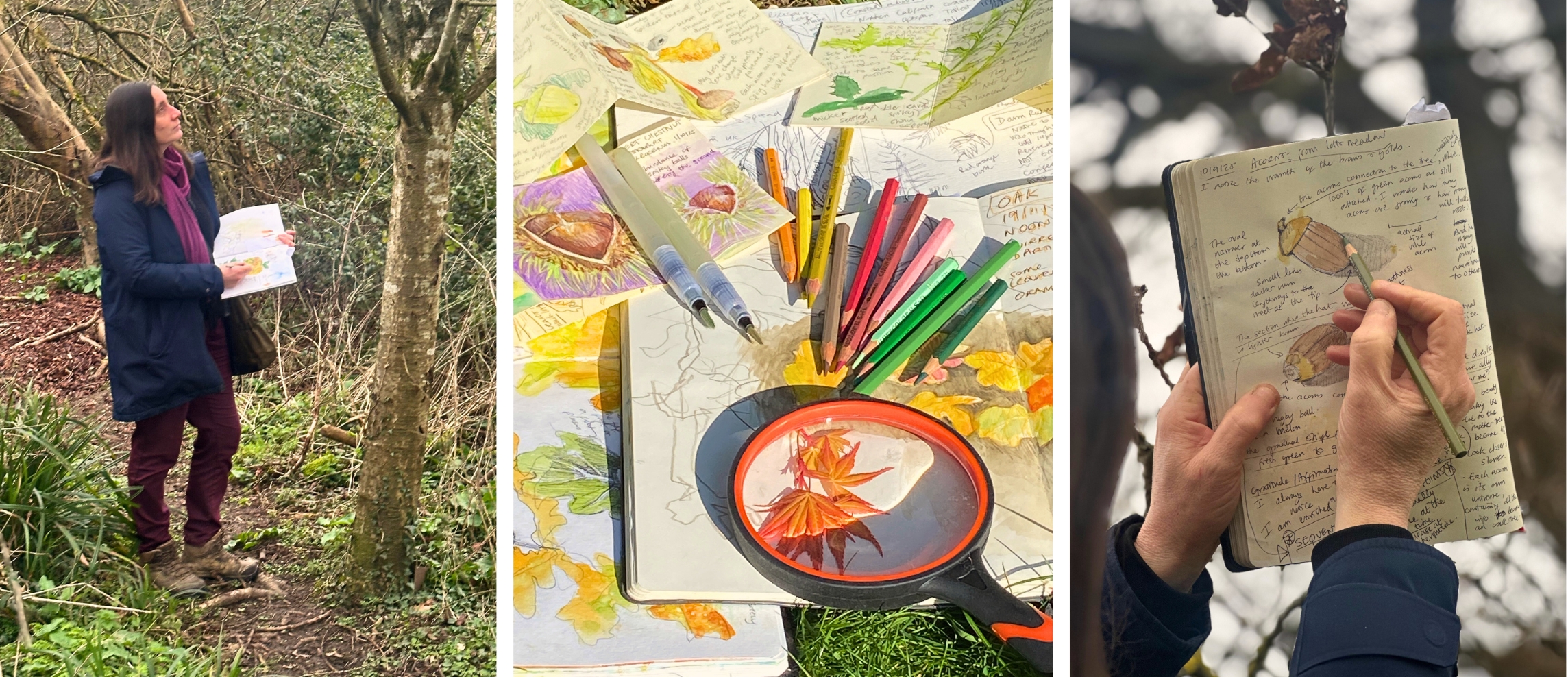 By moving between the wider presence of trees in the landscape and the smaller details found in leaves, flowers, bark, cones and seeds, nature journaling is a creative way of exploring and remembering the places we visit.